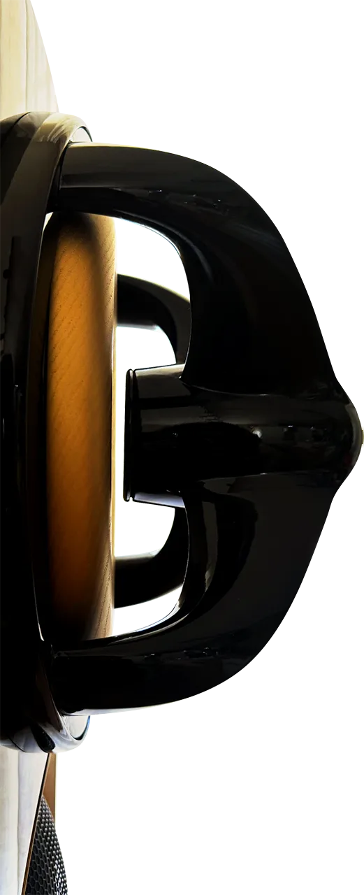 Its curved enclosure with non-parallel walls contributes to an extraordinary sound image. Various types of wood, surgical-grade steel, and carefully selected 3D printing materials give shape to this piece of technological art.